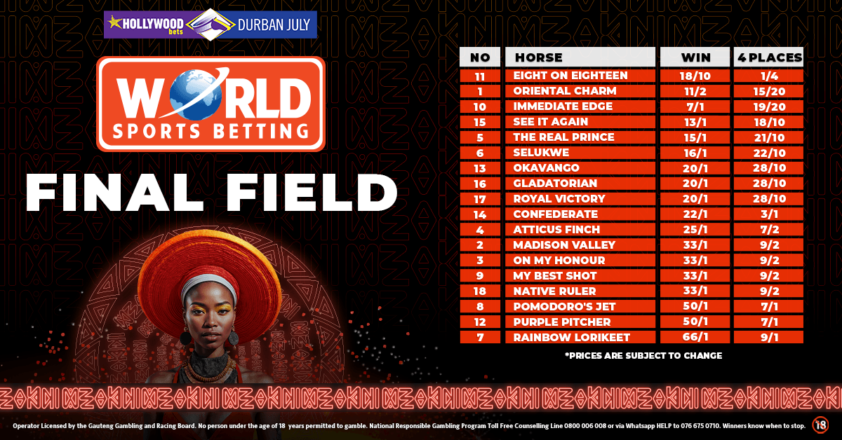 The stage is set for Africa’s premier horse racing event – the Hollywoodbets Durban July – as the final field of 18 runners was officially revealed at a glittering function held at HWB Greyville on Tuesday afternoon.