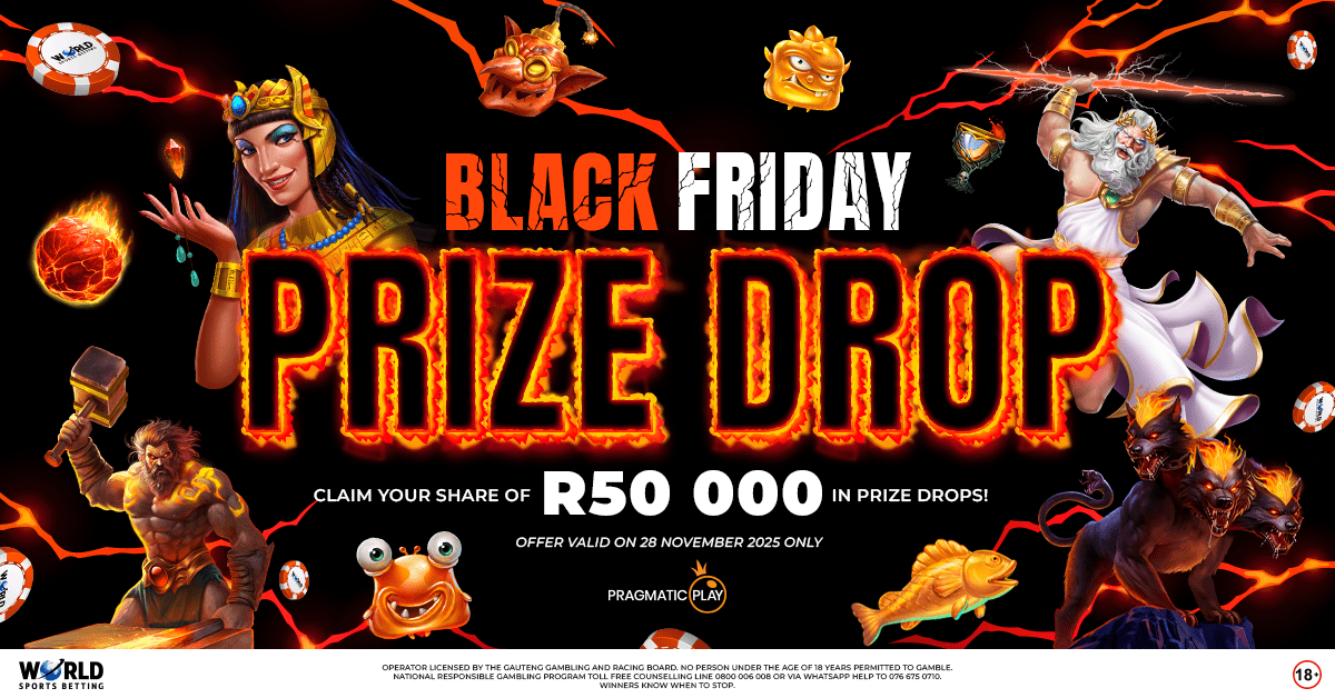 Celebrate Black Friday with World Sports Betting’s Black Friday Prize Drops! Place a minimum R2 bet on any Pragmatic Play slot on 28 November 2025 and stand a chance to win your share of R50,000 in instant cash prizes. Random drops, real winnings, no turnover.