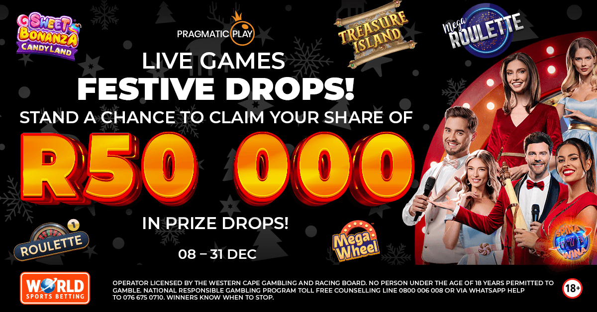 The festive season has officially arrived at World Sports Betting, and weโre celebrating in the best way possible โ with R50,000 in instant cash prizes waiting to drop at random across our most popular Pragmatic Live Games!