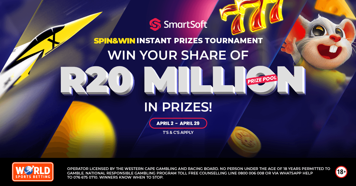 Join the Smartsoft Spin & Win promotion at World Sports Betting and stand a chance to win your share of R20 million in cash prizes. Play Smartsoft games from 2β29 April 2026.