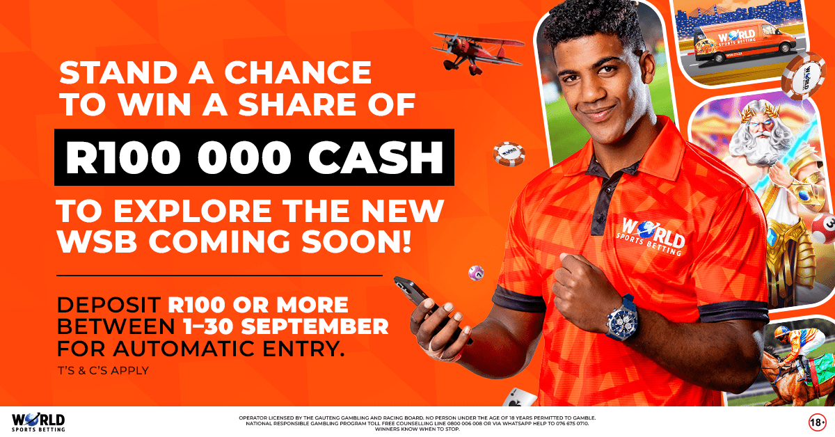 With R100 000 cash on the line and a brand-new platform launching soon, there’s never been a better time to get involved. Deposit, enter, and get ready to bet smarter, play bigger, and win more with the all-new worldsportsbetting.co.za.