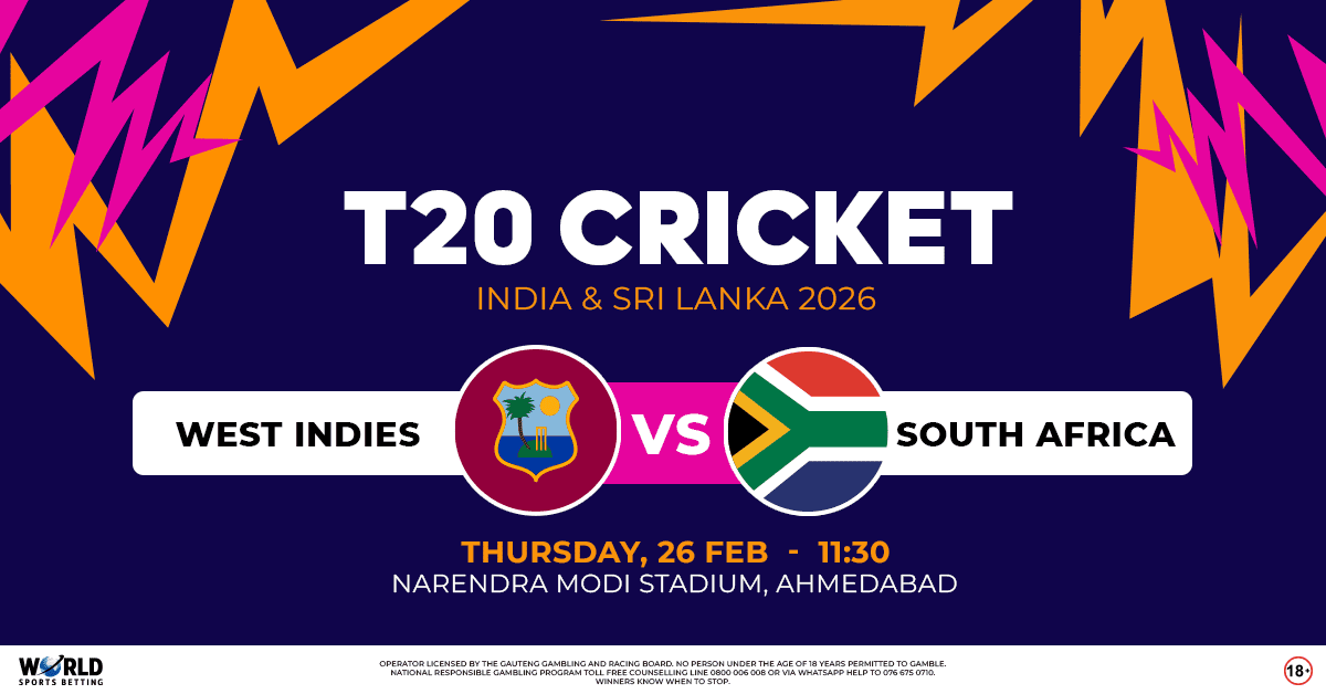 World Sports Betting: Authorized betting operator promoting responsible gambling. Participants must be 18+. Winners know when to stop. For support, contact the South African Responsible Gambling Foundation at 0800 006 008 or WhatsApp ‘HELP’ to 076 675 0710. Your safety matters to us.