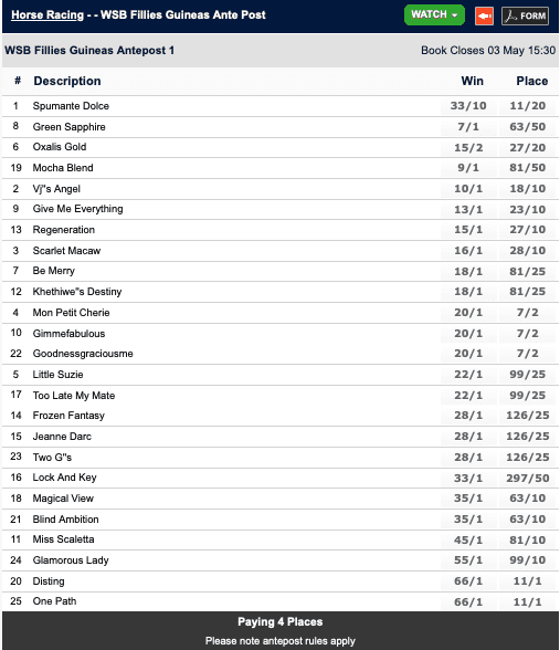 Get ahead of the game and lock in the best prices in the ante-post markets for Guineas Day. Whether you’re backing the big guns or searching for value, WSB has you covered with: