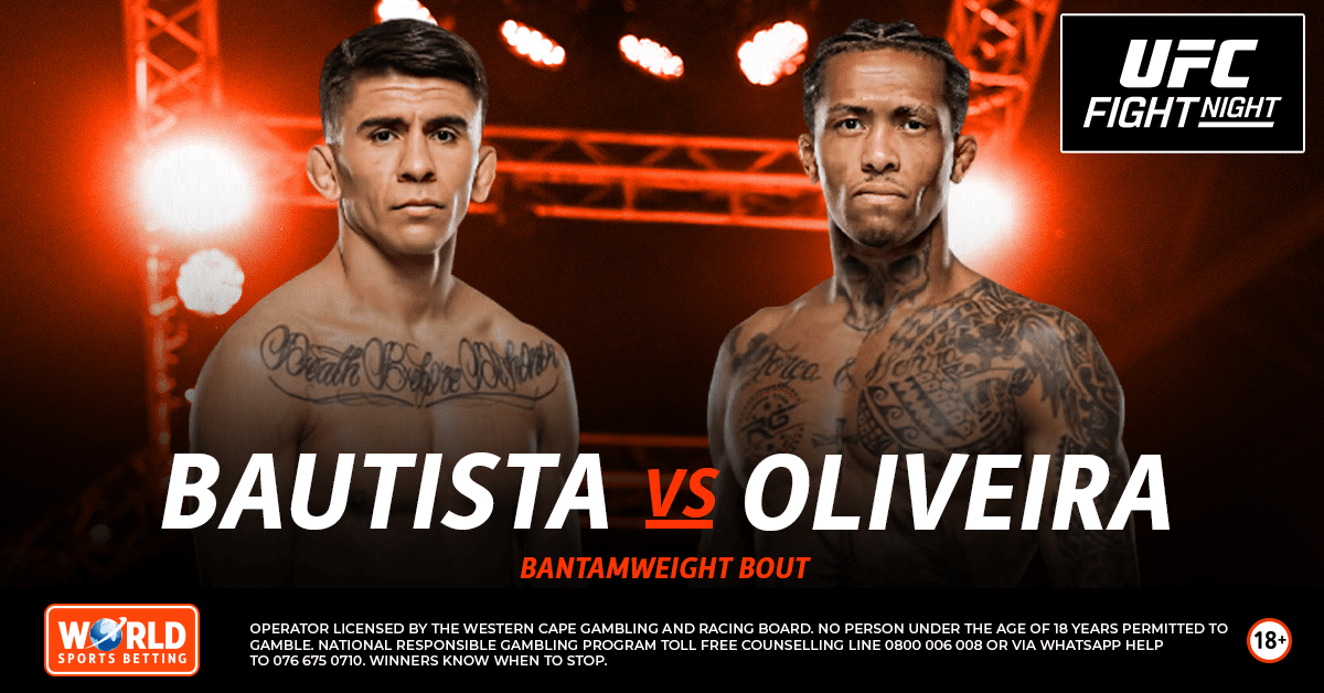 UFC Fight Night takes place at the Meta APEX in Las Vegas on Saturday the 7th of February (early Sunday in South Africa) with an intriguing bantamweight main event as Mario Bautista faces rising Brazilian contender Vinicius Oliveira. We take a closer look at the headline bout as well as two additional fights on the Main Card from a betting angle.
