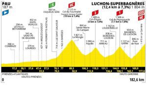 The 1st 60km are flattish but the road starts rising to the sprint point at the bottom of the 1st HC climb the legendary Col du Tourmalet. It is then up and down all day with a Cat 2, a Cat 1 and finally Luchon-Superbagnères an HC climb of 12.4km at 7.3%.