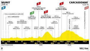 Stage 15 of the Tour de France sees the riders set out from Muret and finish 169.3km later in Carcassone. The terrain is a lot friendlier than Stage 14 but there are 2 Cat 3 climbs and a Cat 2 in the 2nd half that should make it too tough for the pure sprinters.
