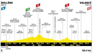 The start is fairly flat with an intermediate sprint after 47.9km. There is then a Cat 4 clim topping out at 66.3km and another one at 177km with a downhill and flat final 53km.